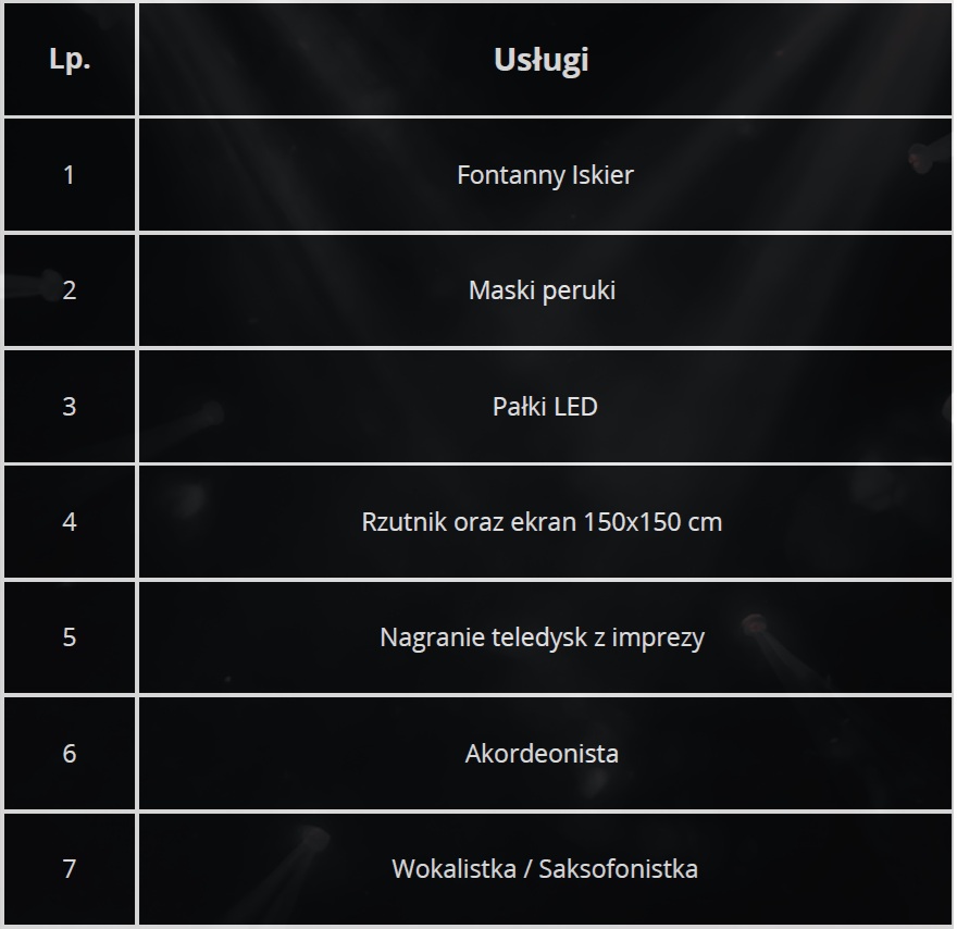 Fontanny Iskier Maski peruki Pałki LED Rzutnik oraz ekran 150x150 cm Nagranie teledysk z imprezy Współpracujemy / Polecamy ! Wokalistka / Saksofonistka Patrycja Jastrząb tel. 888 410 438 Wokalistka / Saksofonistka Patrycja Jastrząb tel. 888 410 438 Akordeonista Adrian Gosiewskitel. 664 135 788 Fotograf / Produkcja filmówStudio GumkowskiBartosz GumkowskiTel: 575 999 516Mail: studiogumkowski@gmail.comhttps://www.facebook.com/profile.php?id=100090653269648 FotografMaciej JarząbekMJ PhotographyTel: 660 373 544https://www.facebook.com/maciejjarzabekphotography